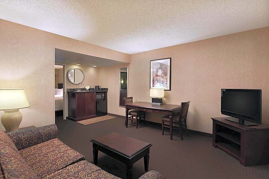 2-room suite, whirlpool tub, work desk, two 32-inch TVs, mini-fridge, microwave, WiFi. This spacious corner suite with one king-sized Sweet Dreams® bed features a separate living room with a sofa bed, armchair, and 32-inch HDTV. Prepare and store snacks with an in-room microwave and mini-refrigerator. Surf the web with complimentary WiFi. Unwind in the bedroom on the king-sized bed and watch a movie on a second 32-inch HDTV. The bathroom features a whirlpool tub and plush terry robes.